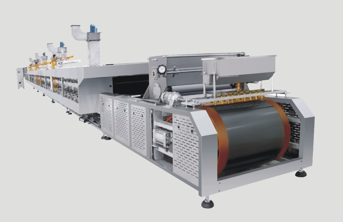 主要功能及用途 该设备是我公司开发的新一代蛋糕生产流水线,从搅拌成形、挤料、烘烤、挤馅、卷圆、切割、冷却杀菌、包装。该机全部采用变频、光、电、气全电脑控制,使操作省事、省力,食品既卫生保质期又长,可选择不同类型的隧道炉(如电力、燃油、燃气、导热油)。